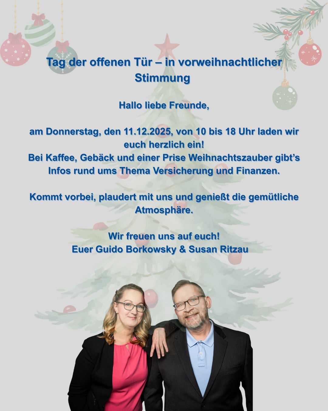 Du hast Fragen rund um Versicherungen, Finanzen oder möchtest uns einfach persönlich kennenlernen? Dann bist du bei unserem Tag der offenen Tür genau richtig! Am 04.12.2024 öffnen wir in unserer Agentur in Lutherstadt Wittenberg die Türen und laden dich herzlich ein, uns zu besuchen.