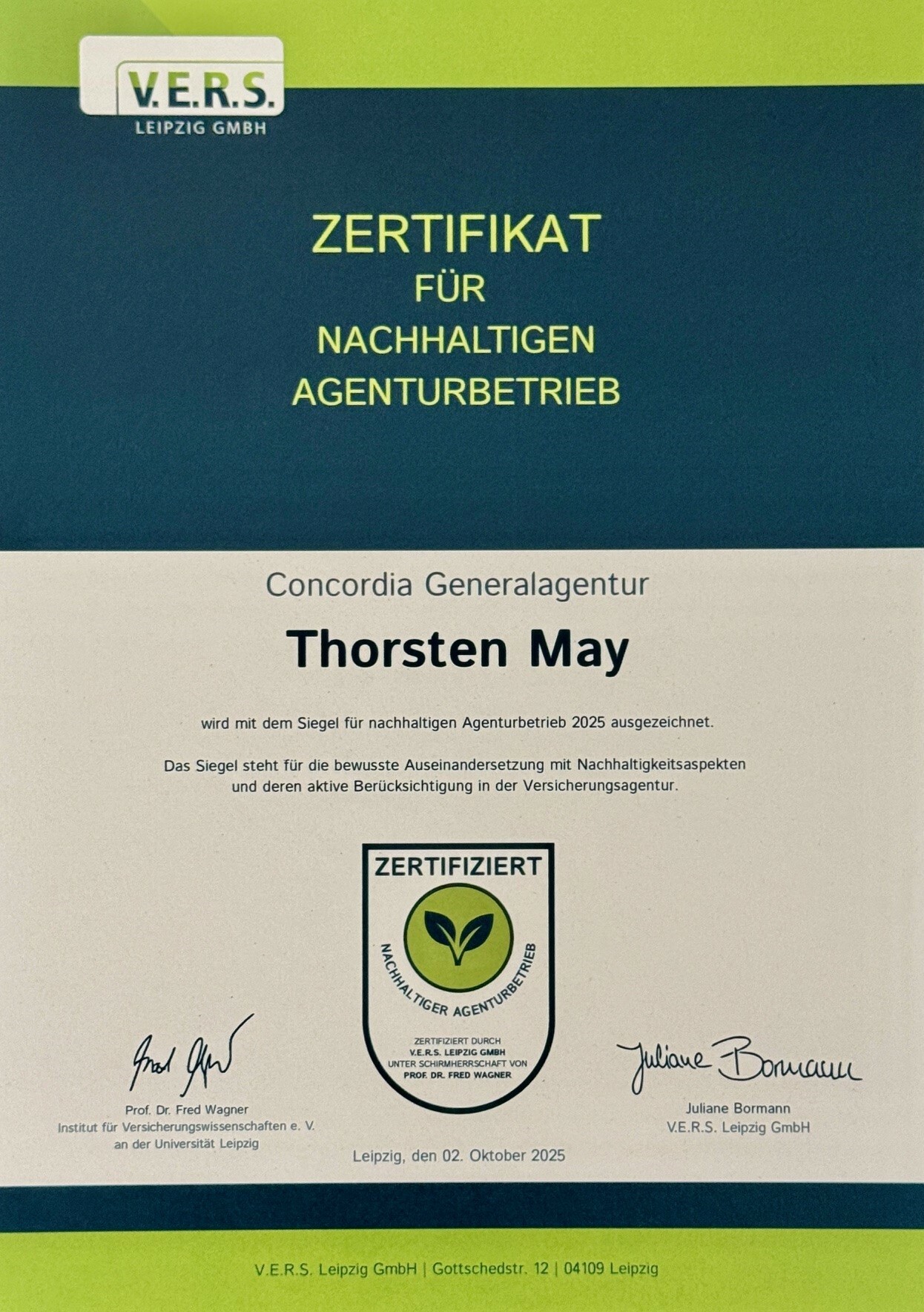 Im Rahmen eines Pilotprojektes erfolgte, nach erfolgreichem Abschluss des Bewertungsprozesses, die Übergabe der Zertifizierungsurkunde in der Concordia Direktion. Als nachhaltige Agentur leiste ich damit einen Beitrag, der über die eigene Organisation hinausgeht. Sie ist Ausdruck unternehmerischer Verantwortung gegenüber Kunden:innen und Mitarbeitenden, für die Region, die Gesellschaft und die kommenden Generationen.